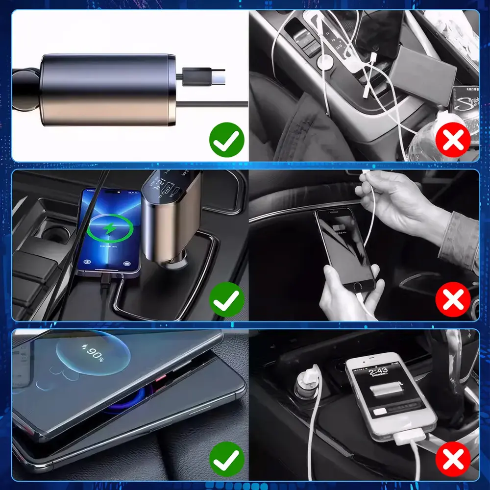Este cargador todo en uno combina carga rápida + cables integrados retráctiles, para que tengas todo ordenado mientras manejás.